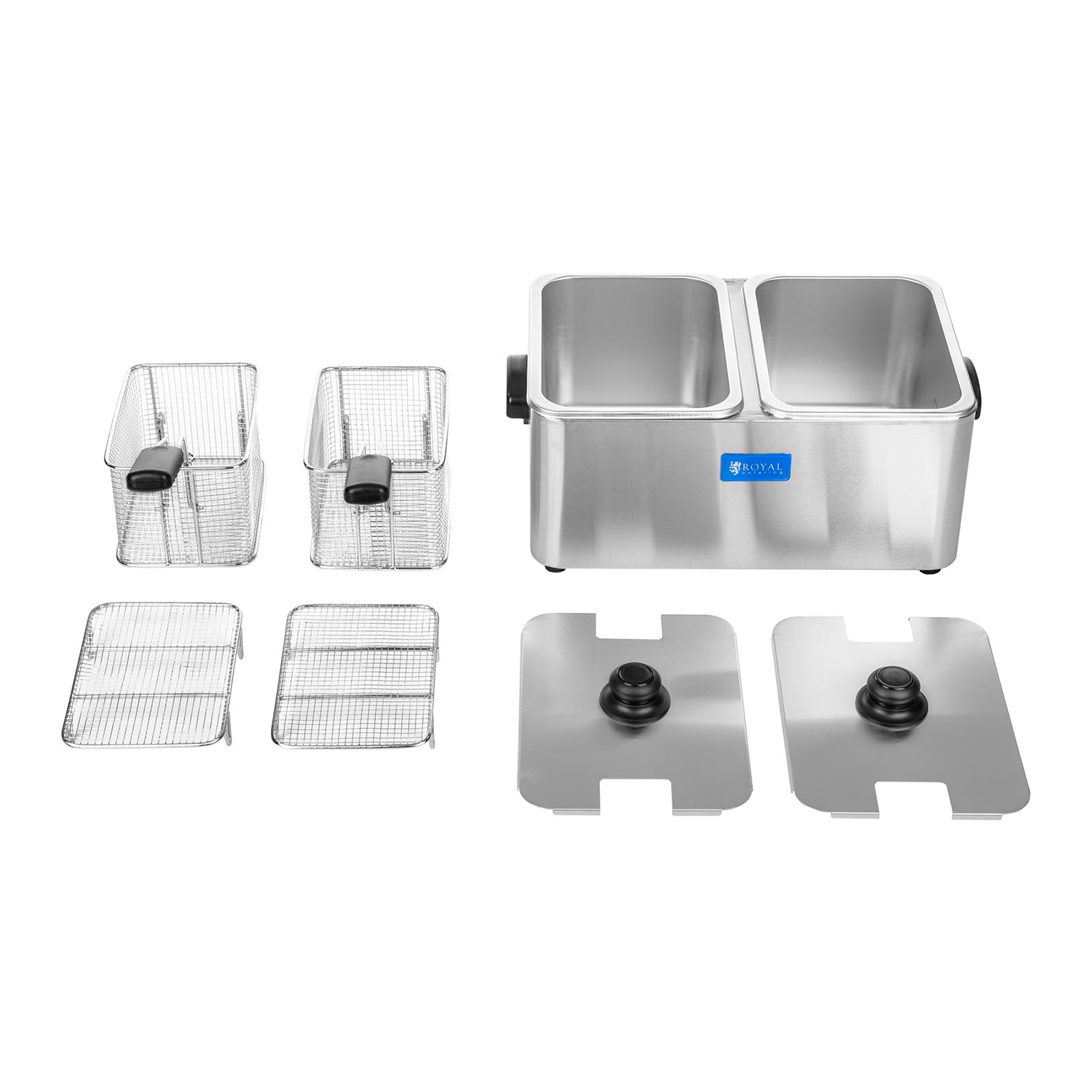 Podwójna frytkownica RCEF 08D-EGO o pojemności 2 x 8 litrów od producenta Royal Catering jest przeznaczona do profesjonalnego użytku w gastronomicznych lokalach. Wykonana jest z wysokiej jakości stali nierdzewnej, dzięki czemu jest skutecznie chroniona przed korozją. W tej frytkownicy zainstalowany jest nowoczesny termostat niemieckiej marki E.G.O. Termostaty firmy E.G.O. należą do najnowocześniejszych i najlepszych termostatów na rynku. Wydajny element grzewczy frytkownicy pracuje z mocą 2500 W. Temperatura ustawiona na termostacie jest utrzymywana dzięki automatycznej kontroli stałości temperatury. Kolejną wartością dodaną frytkownicy jest wyjmowany zbiornik. Producent zadbał, aby zbiorniki były zaokrąglone, co znacznie ułatwia czyszczenie. Kolejną godną uwagi cechą frytkownicy jest jej elastyczność. O wytrzymałość i stabilność dbają antypoślizgowe gumowe nóżki. Specjalne zimne strefy w dolnej części frytkownicy zapobiegają przypalaniu resztek jedzenia.
