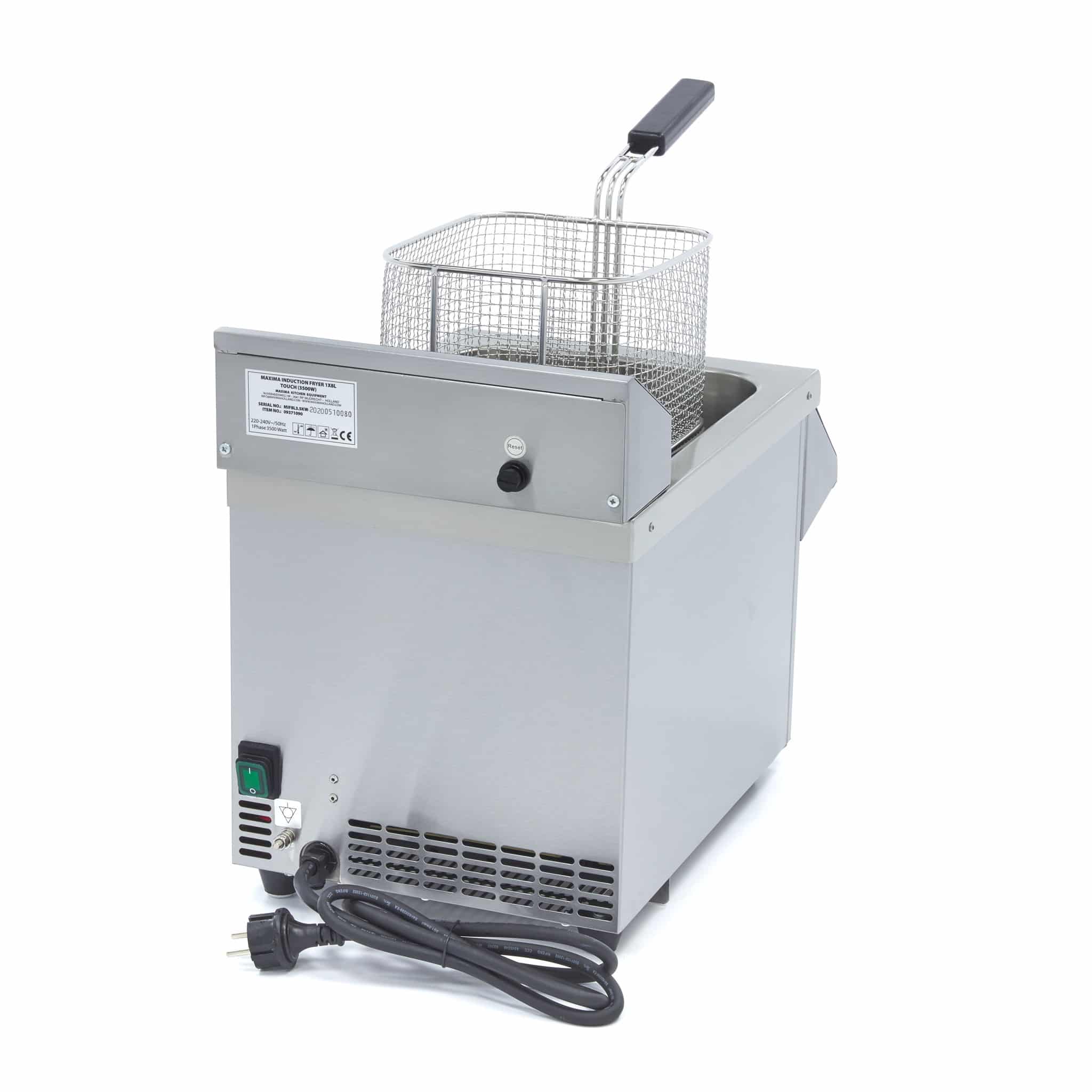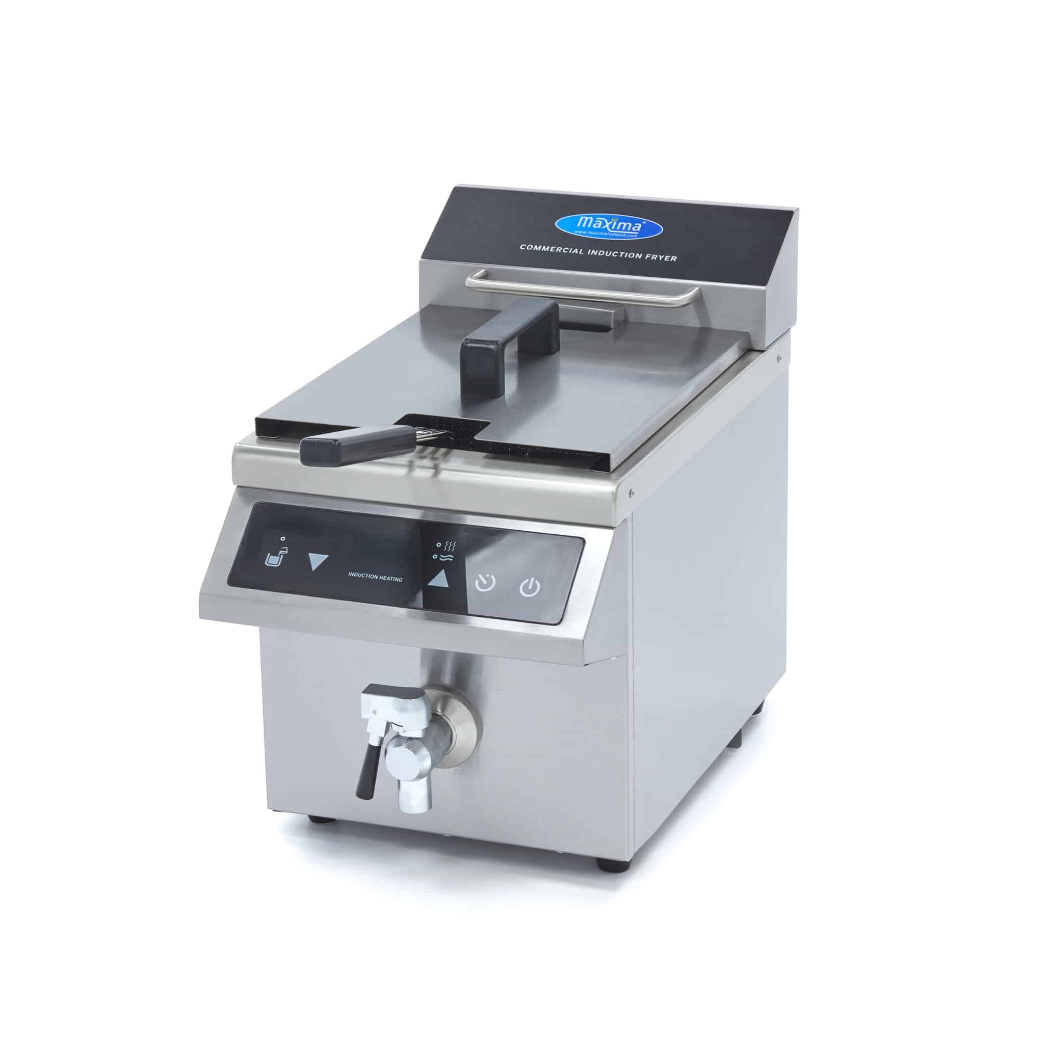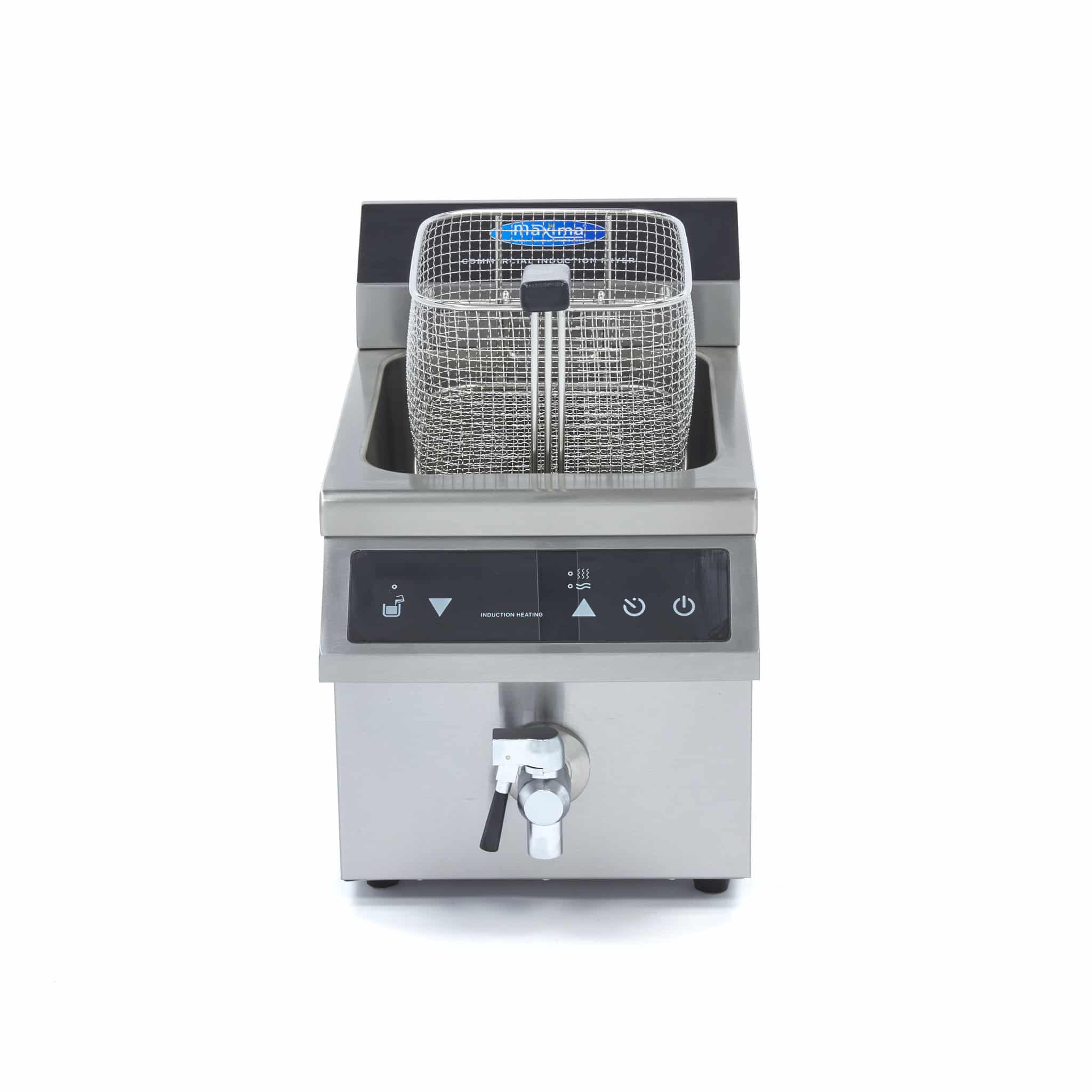 Frytownica indukcyjna z kranikiem – 1×8 L | Maxima 09371090 to luksusowa, cateringowa frytownica indukcyjna 1 x 8 litrów z wyświetlaczem LED i panelem dotykowym. To profesjonalna frytownica z regulowanym timerem 0 – 120 minut. Zakres temperatury 60 – 190 °C. Wyposażona w kranik spustowy.