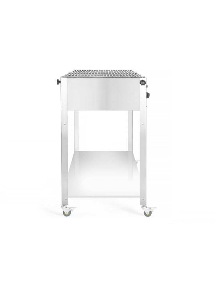 • Zawiera patelnię pokrywającą połowę grilla, 2 niklowane górne ruszty oraz zdejmowaną podstawę na kółkach,