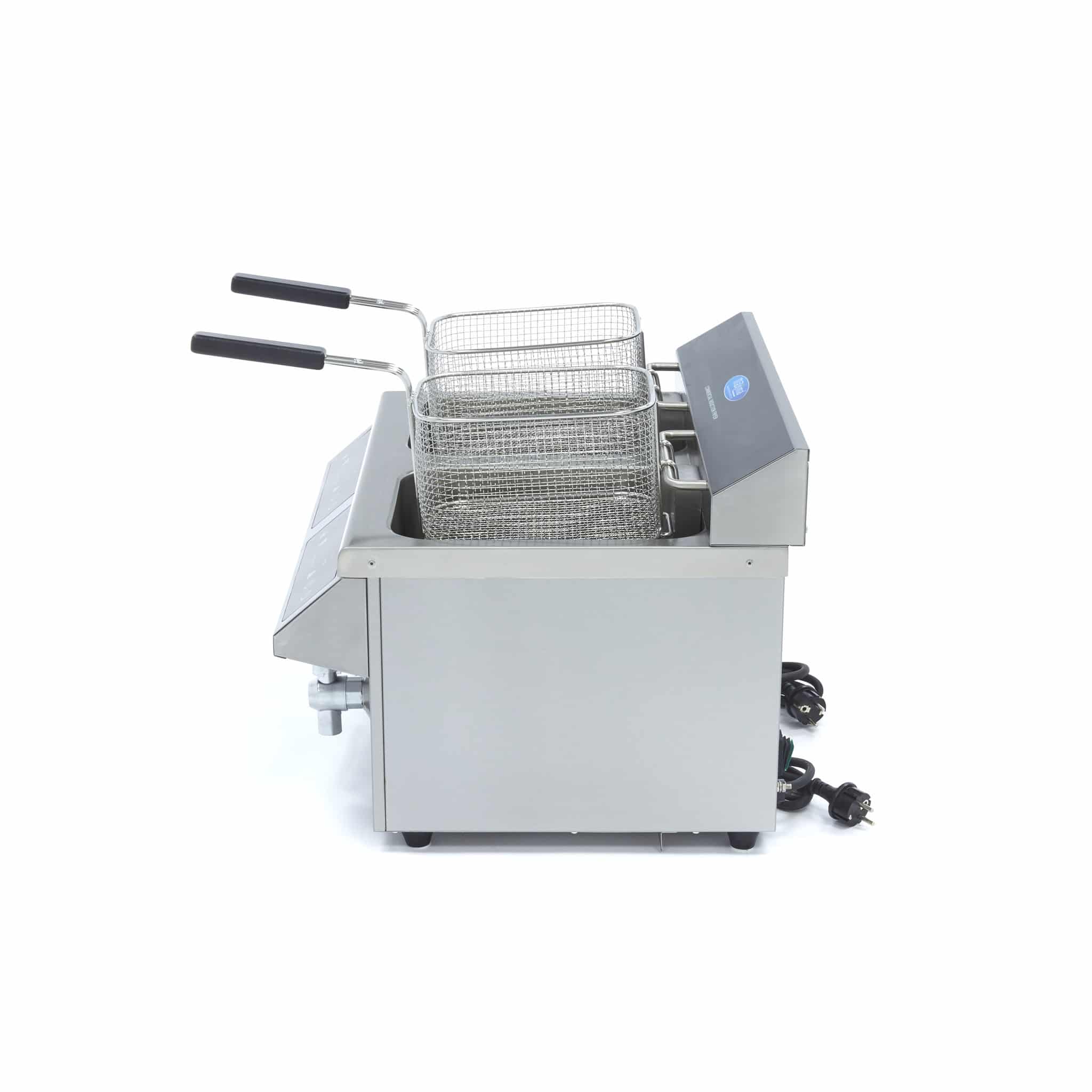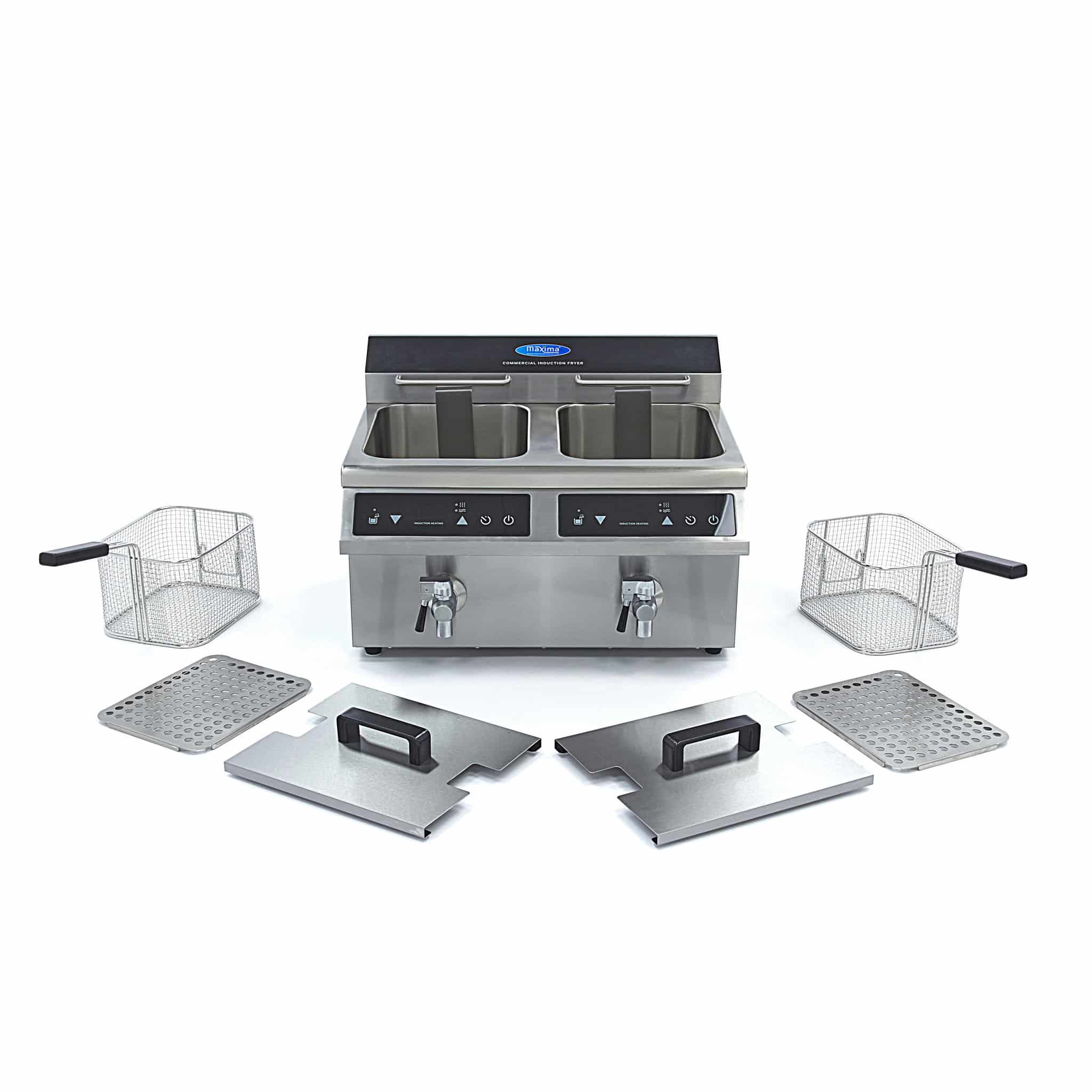Indukcyjna frytownica z kranikiem – 2×8 l | Maxima 09371095 to luksusowa cateringowa indukcyjna frytownica 2 x 8 litrów z wyświetlaczem LED i panelem dotykowym. To profesjonalna frytownica z regulowanym timerem 0 – 120 minut. Zakres temperatury 60 – 190 °C. Wyposażona w kranik spustowy. Poniżej znajdziesz wszystkie cechy tego modelu: