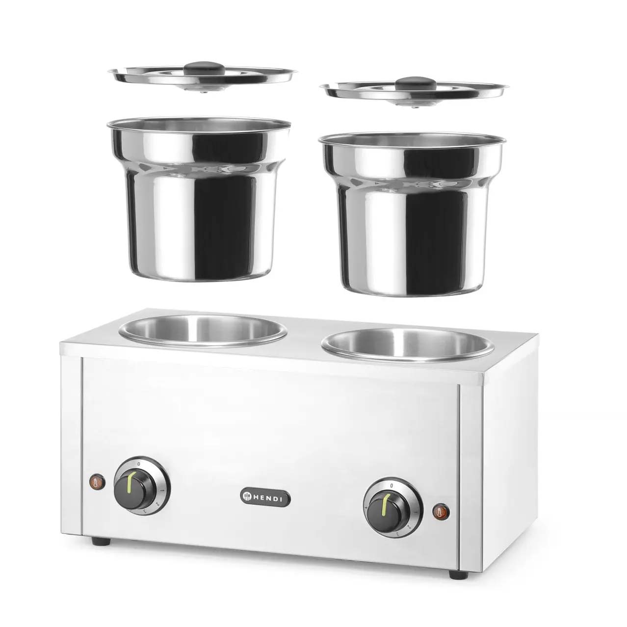 Kąpiel wodna Thermosystem 2 – 8,4 L | Hendi 201206 posiada 2 emaliowane pojemniki na wodę ø185 mm oraz jest wyposażona w 2 garnki na zupę z pokrywką ze stali nierdzewnej ø200 mm. Regulator temperatury: 8°-85°C.