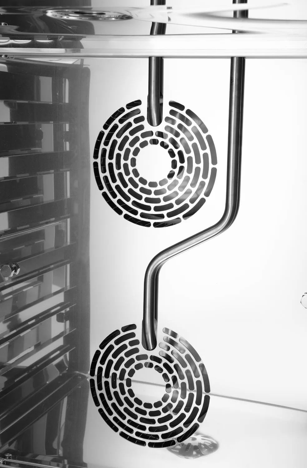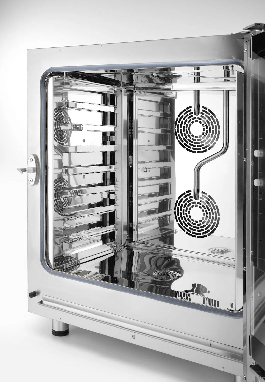 - Bezpieczne drzwi – blokada otwierania drzwi przy 60°, 90°, 120° i 180° zapobiega poparzeniu personelu, do którego mogłoby dojść przez niekontrolowany ruch drzwi po ich otwarciu