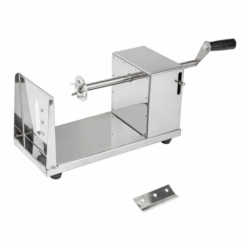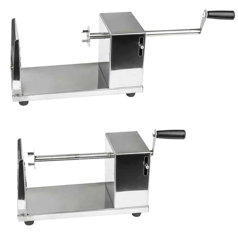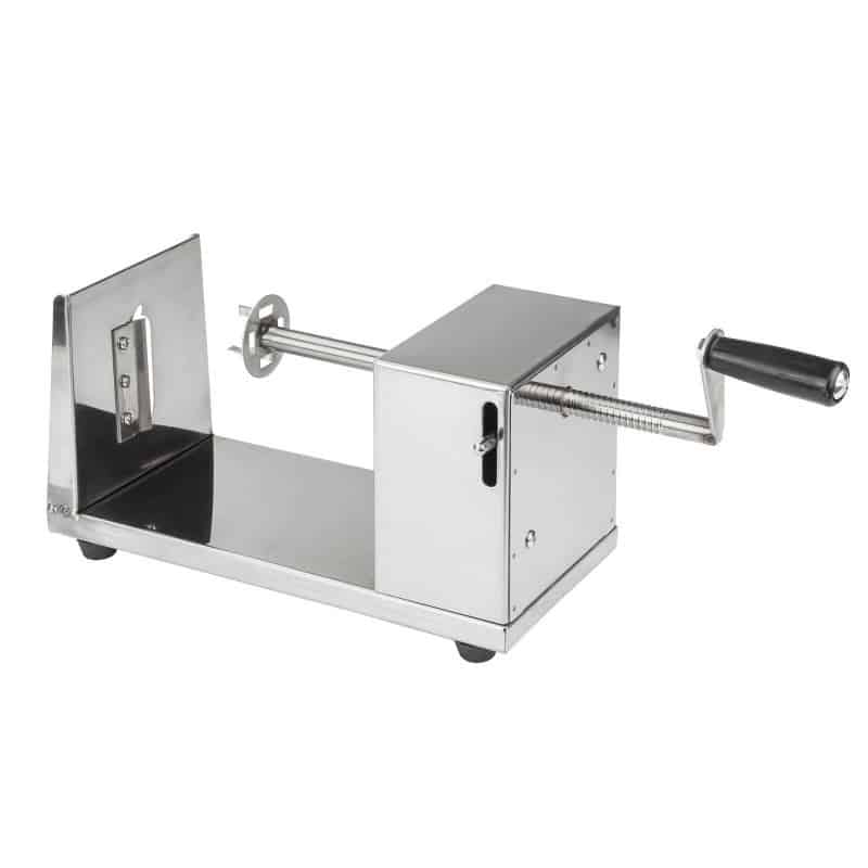 - Łatwa obsługa – surowego ziemniaka przed krojeniem należy przebić mocnym drewnianym patyczkiem, po pokrojeniu i wyjęciu z urządzenia rozciąga się na patyczku w regularną spiralę. Tak przygotowany można włożyć do frytkownicy lub piekarnika. W kilka sekund szybko, czysto i bezpiecznie przygotujesz smaczne ziemniaczane „chipsy”.