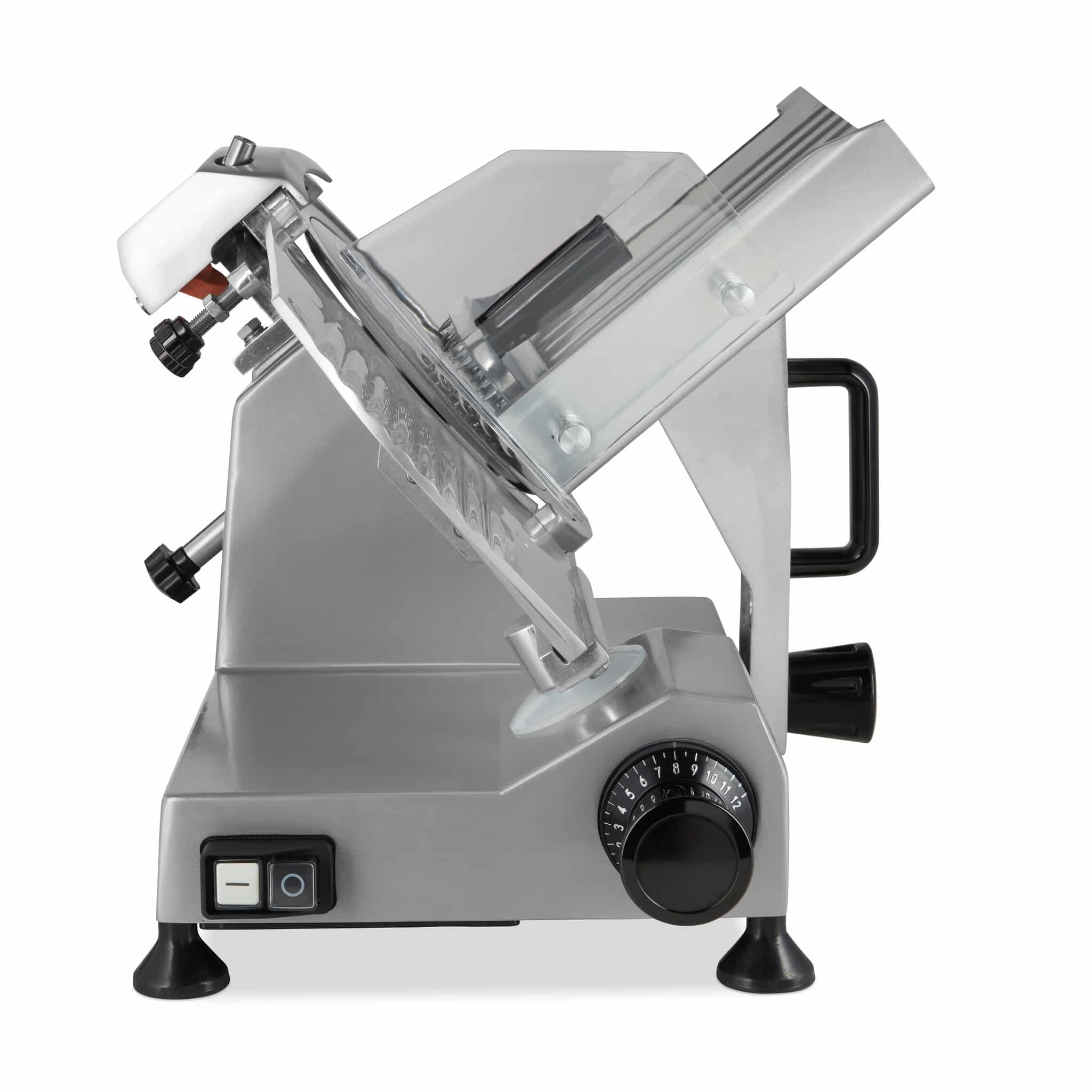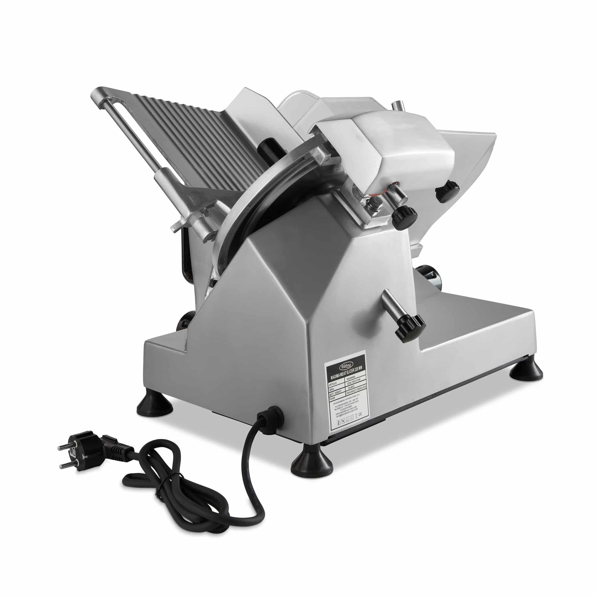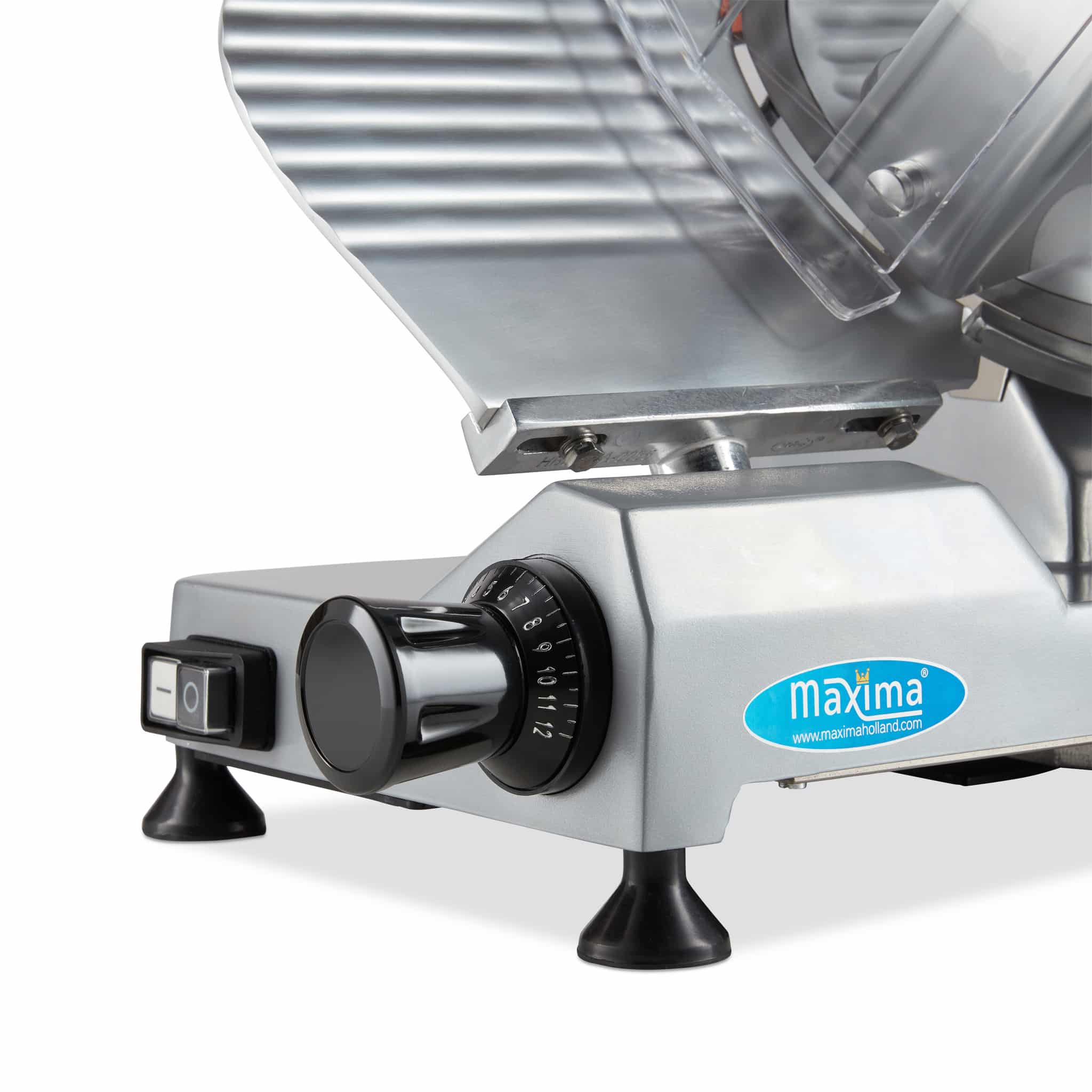 Krajalnica do mięsa Maxima – krajalnica do wędlin | MS 220 posiada solidną aluminiową konstrukcję oraz hartowane ostrze ze stali nierdzewnej o średnicy 220 milimetrów. Dostępne są również dwa inne modele krajalnic do mięsa Maxima z inną średnicą ostrza.