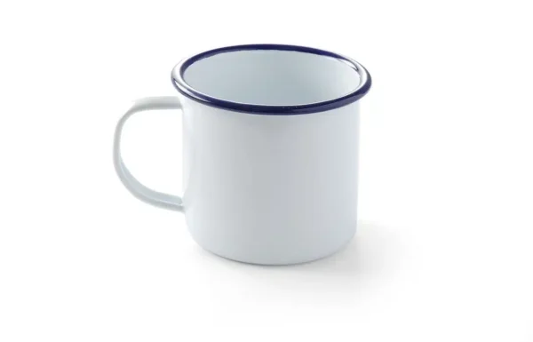 Kubek z uchem – 0,36 L | Hendi 621295 to elegancki kubek wykonany ze stali pokrytej białą emalią z delikatnym niebieskim rantem.