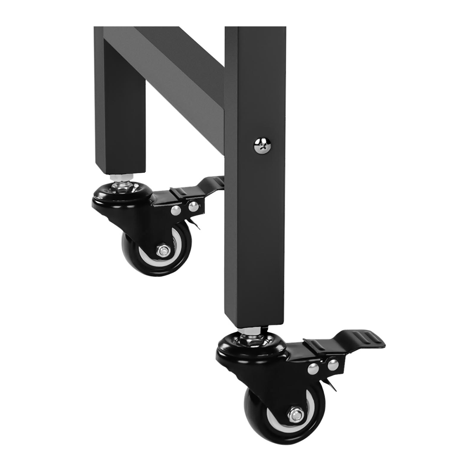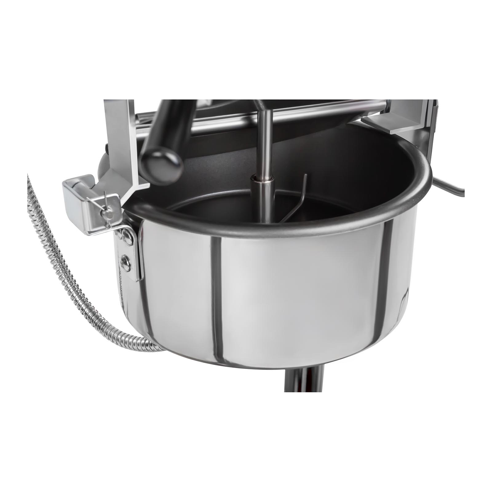 Dzięki wózkowi maszyna jest zawsze gotowa do mobilnego użytku. Duże przednie koła zapewniają stabilne ustawienie urządzenia, a mniejsze tylne kółka obracają się o 360° i ułatwiają manewrowanie wózkiem. Dwa hamulce blokujące umożliwiają bezproblemowe korzystanie z urządzenia. Maszynę można łatwo i cicho przemieszczać dzięki kółkom z gumową powłoką. Po bocznej stronie wózka znajduje się klapka do serwowania popcornu, przez którą można łatwo pobierać i dozować pyszny popcorn. W dolnej części maszyny znajduje się przegródka przeznaczona do przechowywania gotowego popcornu, który można szybko zaoferować głodnym klientom, oszczędzając im czas.