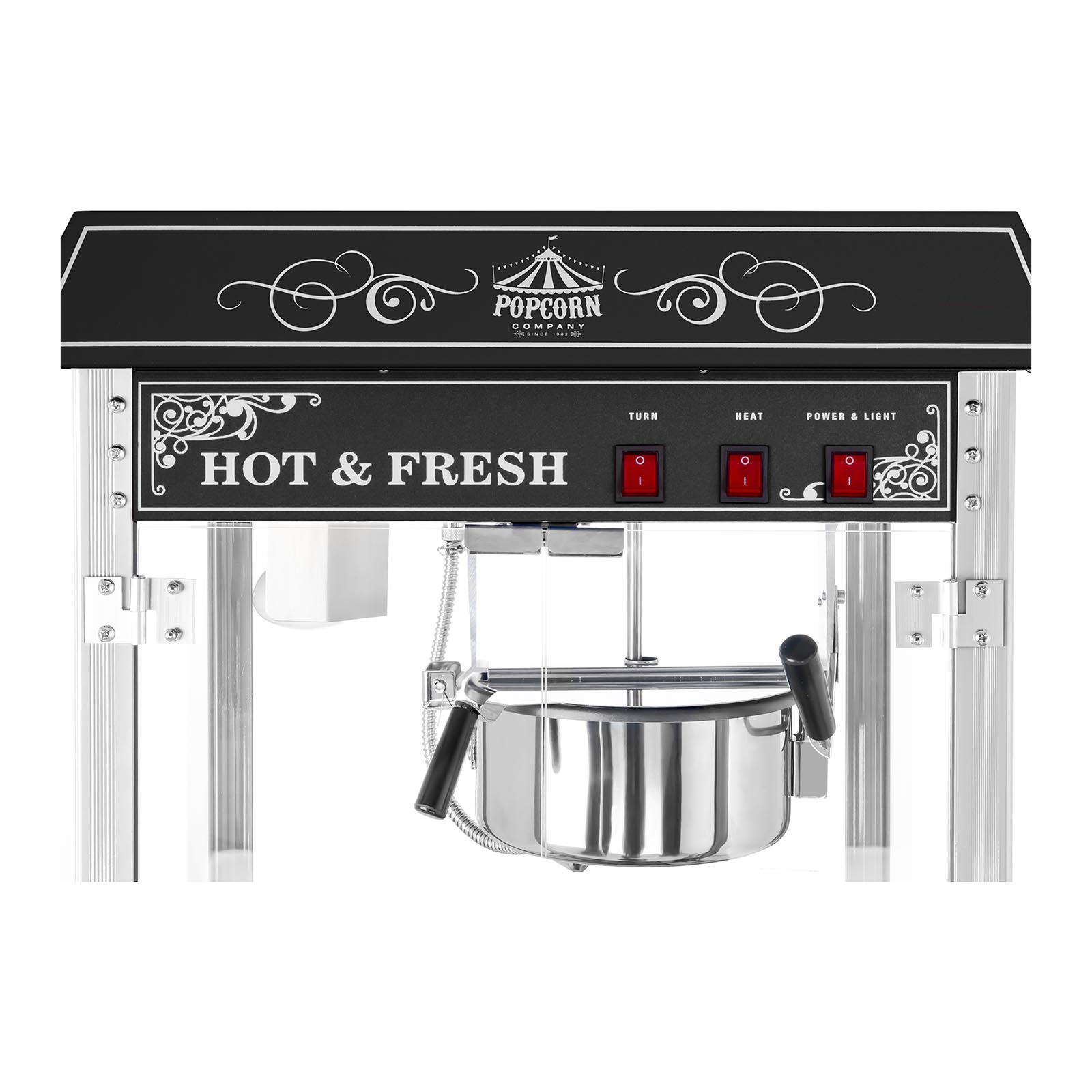 Popcorn prezentuje się szczególnie atrakcyjnie dzięki dużym szybom ze szkła hartowanego i wbudowanemu oświetleniu. Atrakcyjny i kultowy amerykański retro design wraz z efektownymi naklejkami, które wytrzymują wysokie temperatury, przyciąga uwagę przechodniów i zachwyca miłośników popcornu przy każdej okazji. Z tą maszyną do popcornu o wyrazistym kolorze i nietypowym wykonaniu zawsze wyróżnisz się z tłumu i przyciągniesz jeszcze większą liczbę klientów.