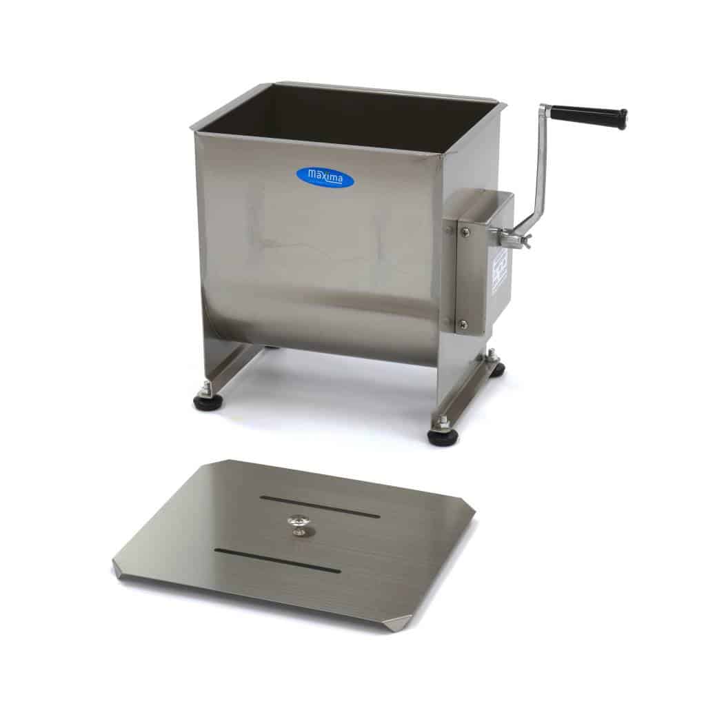 Mieszarka do mięsa na kiełbasy – 30 litrów | Maxima 09300442 to mocna ręczna mieszarka do mięsa ze stalowym nierdzewnym korpusem, ślimakiem i pokrywą. Niezawodne urządzenie do profesjonalnego zastosowania. Odpowiednia dla rzeźników lub do domowego wyrobu kiełbas. Pojemność mieszarki do mięsa to 22,5 kg mięsa.