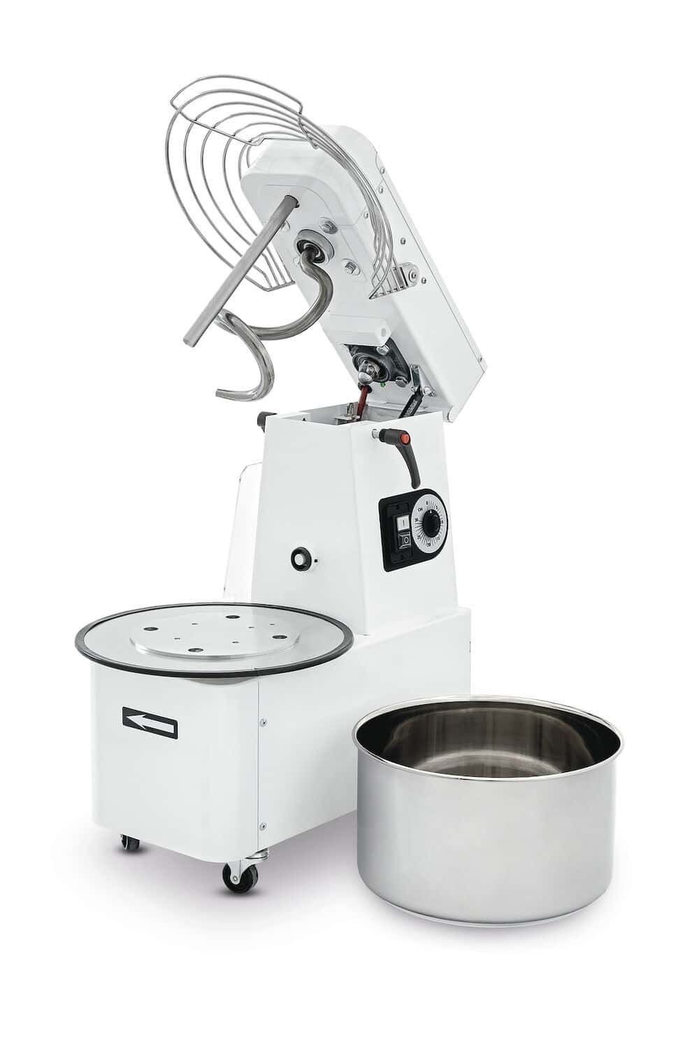 Spiralny mikser z podnoszoną głowicą i wyjmowaną misą od Prismafood efektywnie miesza ciężkie ciasto do 35 kg/h. Spiralny kształt zapewnia idealnie jednorodne ciasto. Idealny na przykład do pizzerii lub piekarni.
