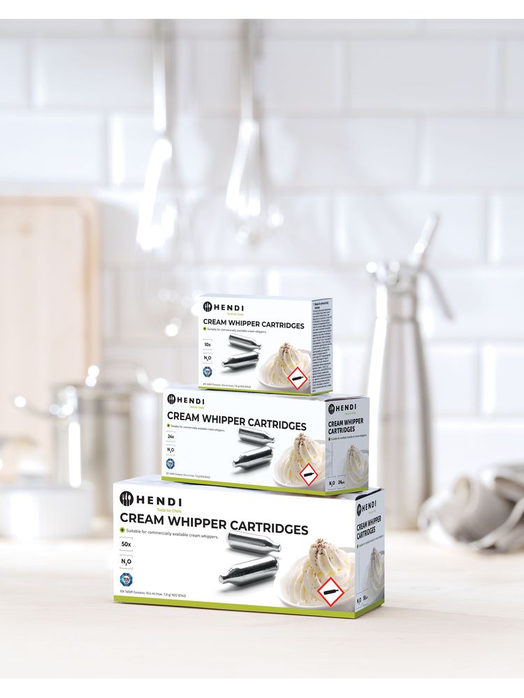 Naboje do bitej śmietany – 50 szt. | Hendi 5869071 to naboje napełnione gazem N2O, które docenią przede wszystkim profesjonaliści za ich bogatą pianę.