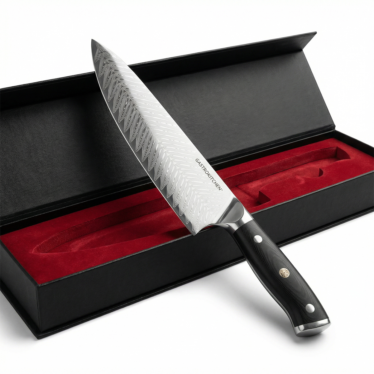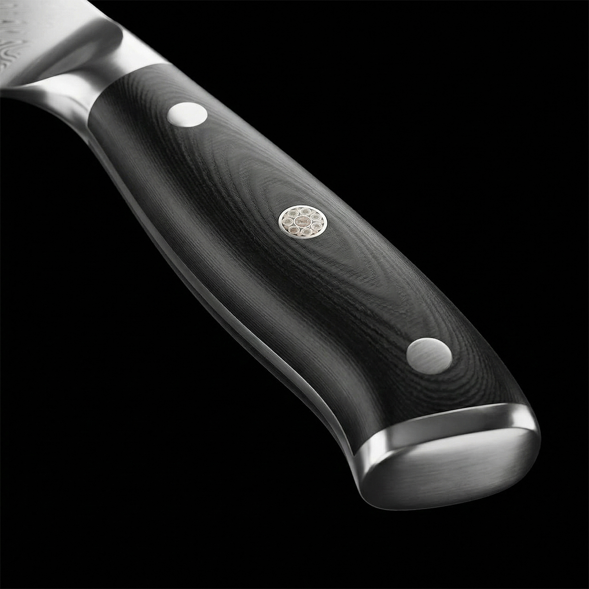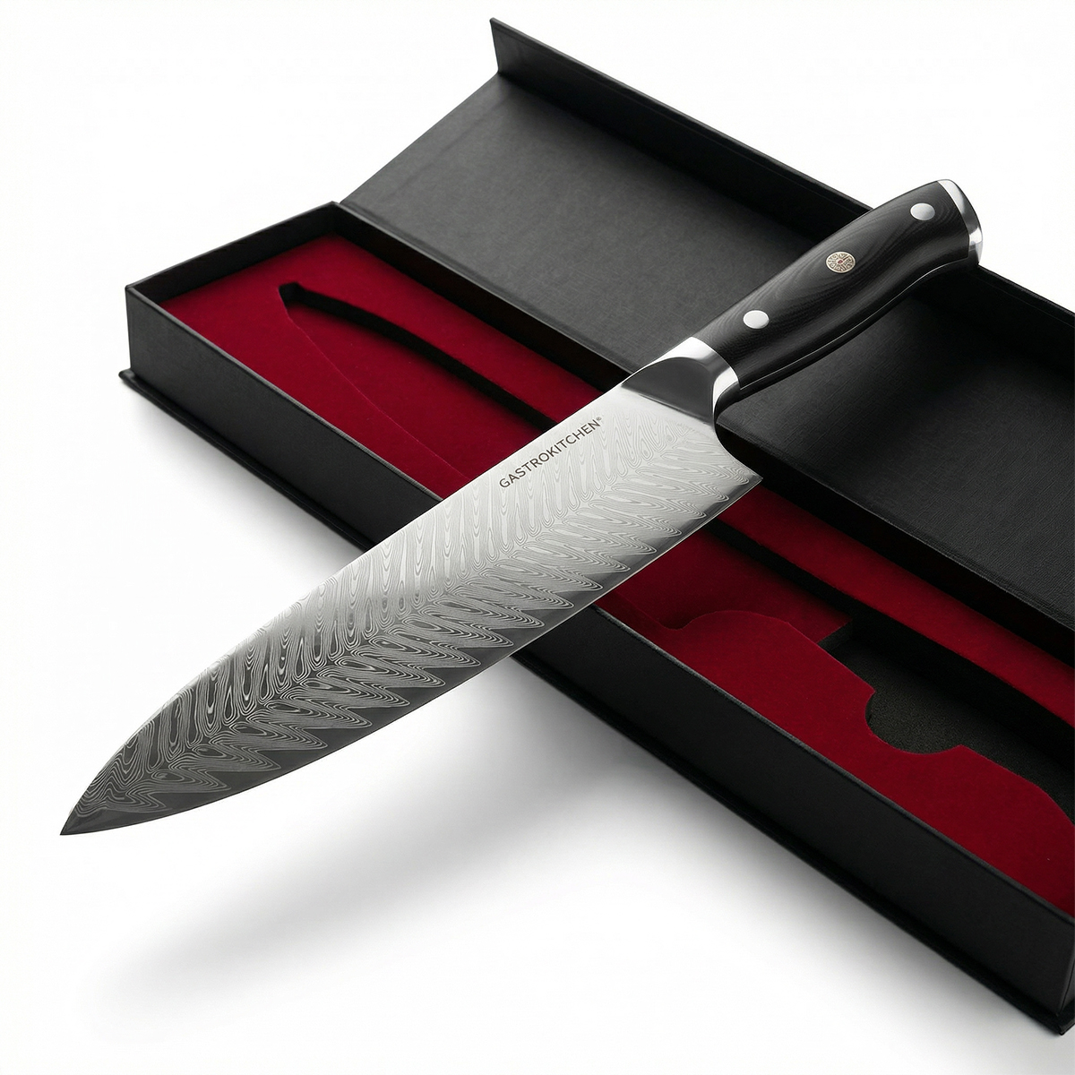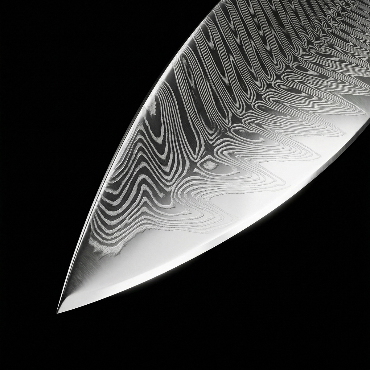 Wyjątkowo ostry nóż z ostrzem 20 cm w japońskim stylu z elementami damasceńskimi. Warstwowa konstrukcja tworzy charakterystyczny „damasceński” wzór oraz zapewnia najwyższą odporność na korozję i stępienie. Dzięki perfekcyjnie wyważonemu pełnemu tangowi oraz ergonomicznej rękojeści z włókna G10 nóż jest wygodny nawet przy całodziennym użytkowaniu w profesjonalnej kuchni. Dostarczany w reprezentacyjnym pudełku prezentowym – idealny prezent dla każdego, kto poważnie podchodzi do gotowania.