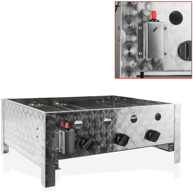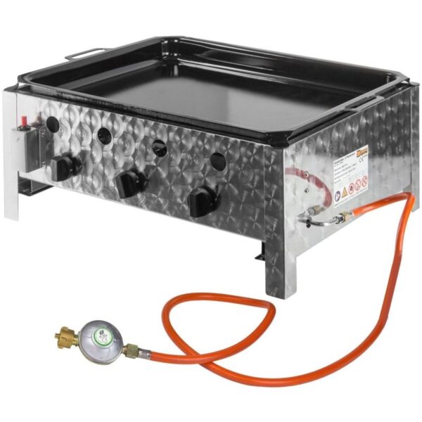Profesjonalny piekarnik gazowy z trzema palnikami, zapłonem piezo, zabezpieczeniem termicznym zapłonu, wężem, reduktorem oraz emaliowaną patelnią. Szybko gotowy do pracy, łatwy w utrzymaniu. Korpus ze stali nierdzewnej z ciężką emaliowaną stalową patelnią, 3 niezależne pokrętła.