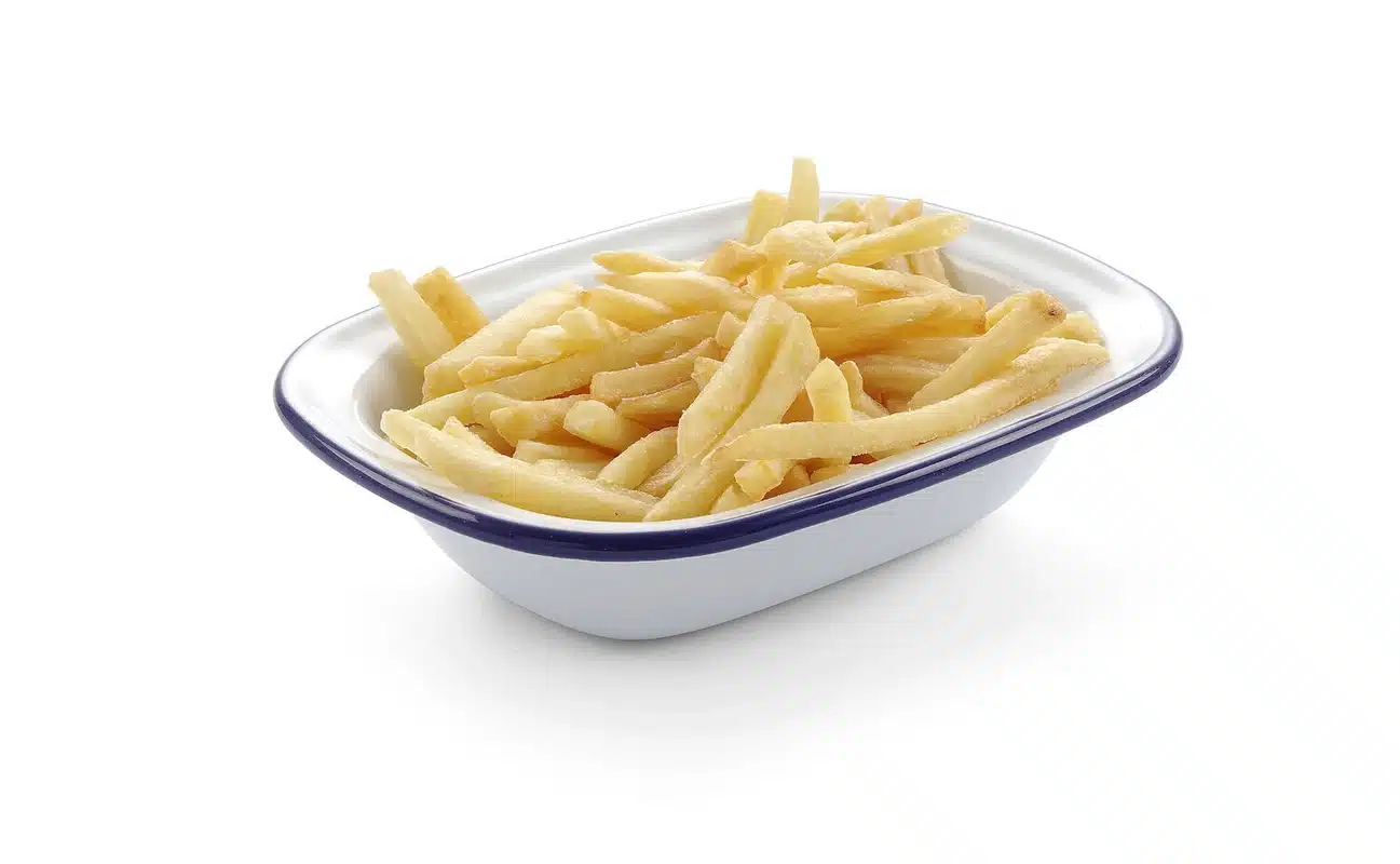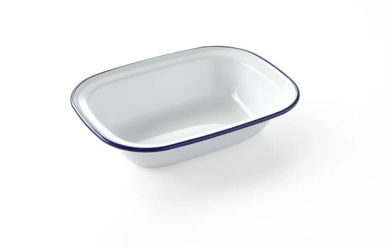 Prostokątna misa – 215×160 mm | Hendi 621219 to elegancka misa wykonana ze stali pokrytej białą emalią z delikatnym niebieskim rantem.