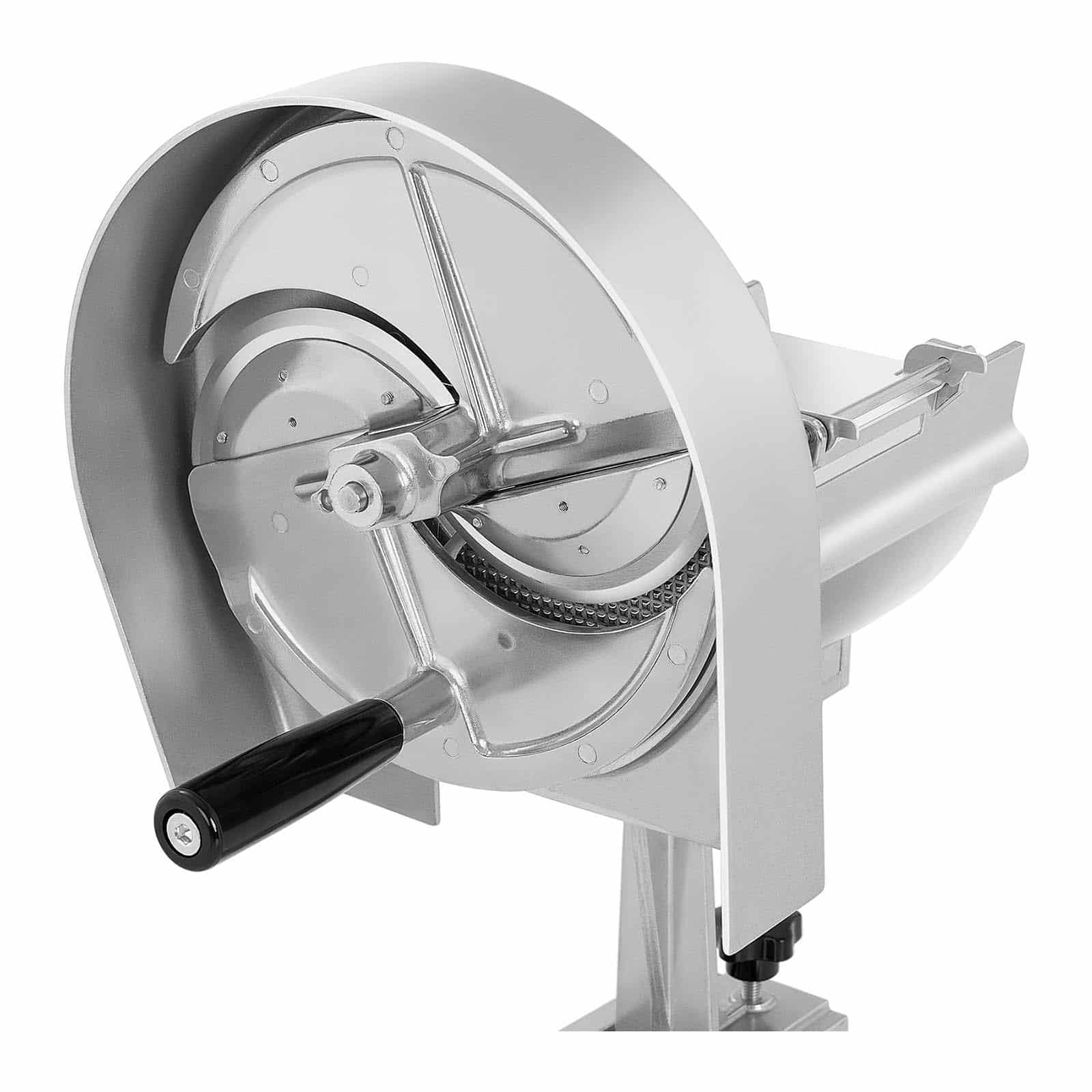 - Warzywa wkłada się do półokrągłego leja wsadowego umieszczonego z tyłu i dociska do tarczy tnącej za pomocą prasy. Tarcza obraca się łatwo dzięki ręcznej korbce, a z krajalnicy wychodzą świeżo pokrojone warzywa. Lej wsadowy posiada pokrywę, która podczas obracania korbki zapobiega wypadaniu warzyw.