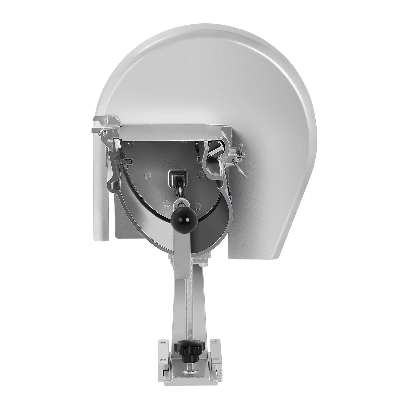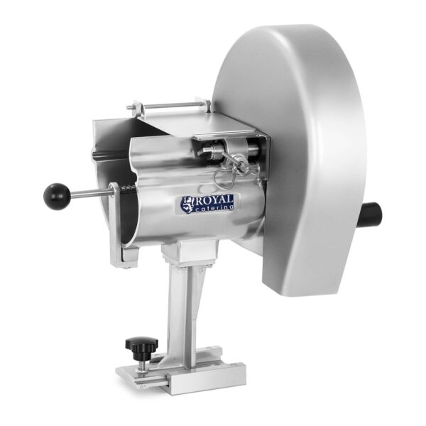 - Krajalnicę do warzyw można w mgnieniu oka przymocować do blatu roboczego za pomocą śrubowego uchwytu i nie wymaga ona zasilania, ponieważ obsługuje się ją praktyczną ręczną korbką umieszczoną na tarczy tnącej. Dzięki temu możesz przygotować warzywa na sałatki w dowolnym miejscu – w swojej kuchni, na targu czy w namiocie cateringowym.