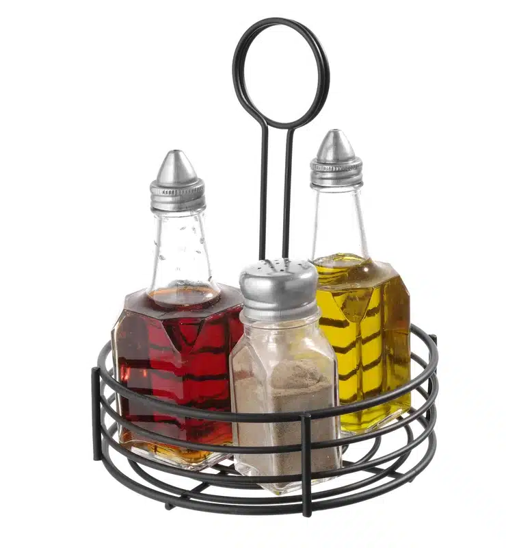 Stojak na przyprawy – okrągły – Ø 165 x 205 mm | Hendi 425787 posiada powierzchnię pokrytą matową czarną powłoką proszkową, jego średnica to 165 mm, a wysokość 205 mm.