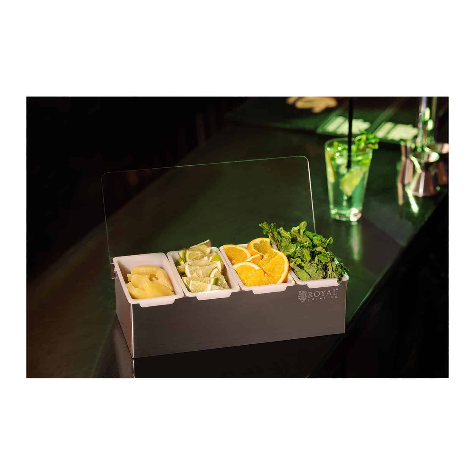 Uniwersalne stojaki na składniki od Royal Catering służą do przechowywania dodatków do napojów lub deserów, przypraw, owoców itp. Wytrzymały model RCCBP 4 wykonany ze stali nierdzewnej został zaprojektowany do zastosowania w barach, pubach, restauracjach, klubach lub podczas wydarzeń plenerowych, ale sprawdzi się także w Twojej kuchni.