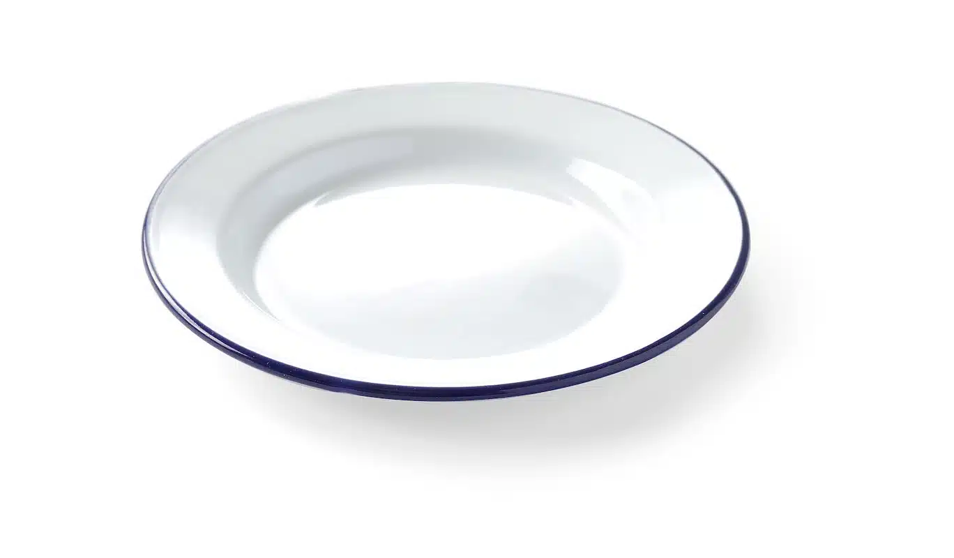 Talerz płytki – emaliowany – Ø 240 mm | Hendi 621233 to elegancki talerz wykonany ze stali pokrytej białą emalią z delikatnym niebieskim rantem.