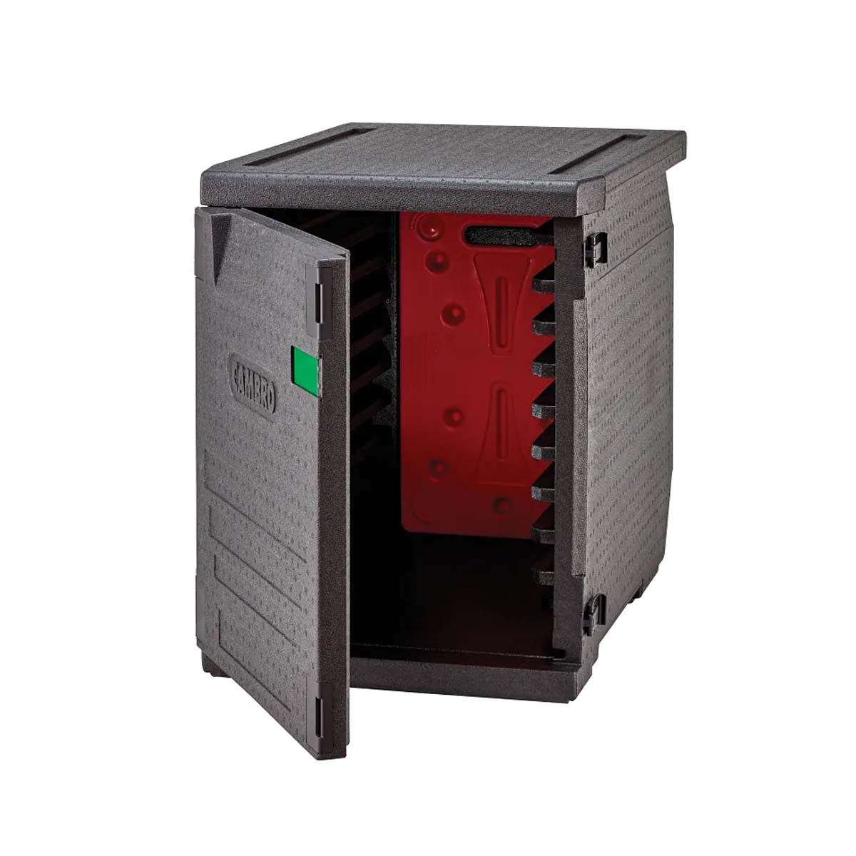 Termoizolacyjny pojemnik Cam GoBox® ładowany od frontu na pojemniki 600×400 mm to produkt firmy Cambro, przeznaczony do utrzymania wymaganej – wysokiej lub niskiej – temperatury żywności podczas transportu na blachach lub w skrzynkach piekarniczych. Pojemnik można używać z wkładami chłodzącymi lub grzewczymi.