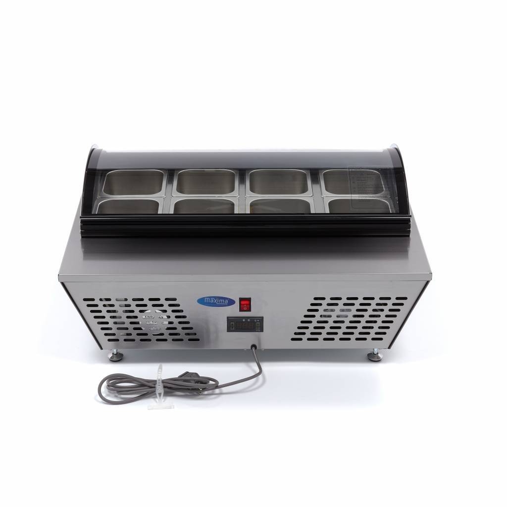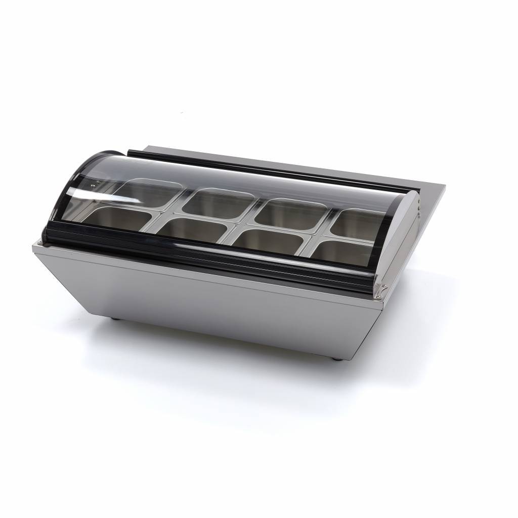 Ta mini saladette to witryna chłodnicza z pokrywą. Pod solidną, uchylną szklaną pokrywą znajduje się miejsce na 8 x 1/6 pojemników GN lub 4 x 1/3 pojemniki GN do przechowywania różnych składników w chłodzie. Dzięki temu mini witryna jest idealnym stanowiskiem roboczym do przygotowywania kanapek lub sałatek. Przestrzeń robocza z przodu wykonana ze stali nierdzewnej może służyć jako praktyczna deska do krojenia. Pojemność wynosi 67 litrów i standardowo dostarczana jest z 8 x 1/6 pojemnikami GN.