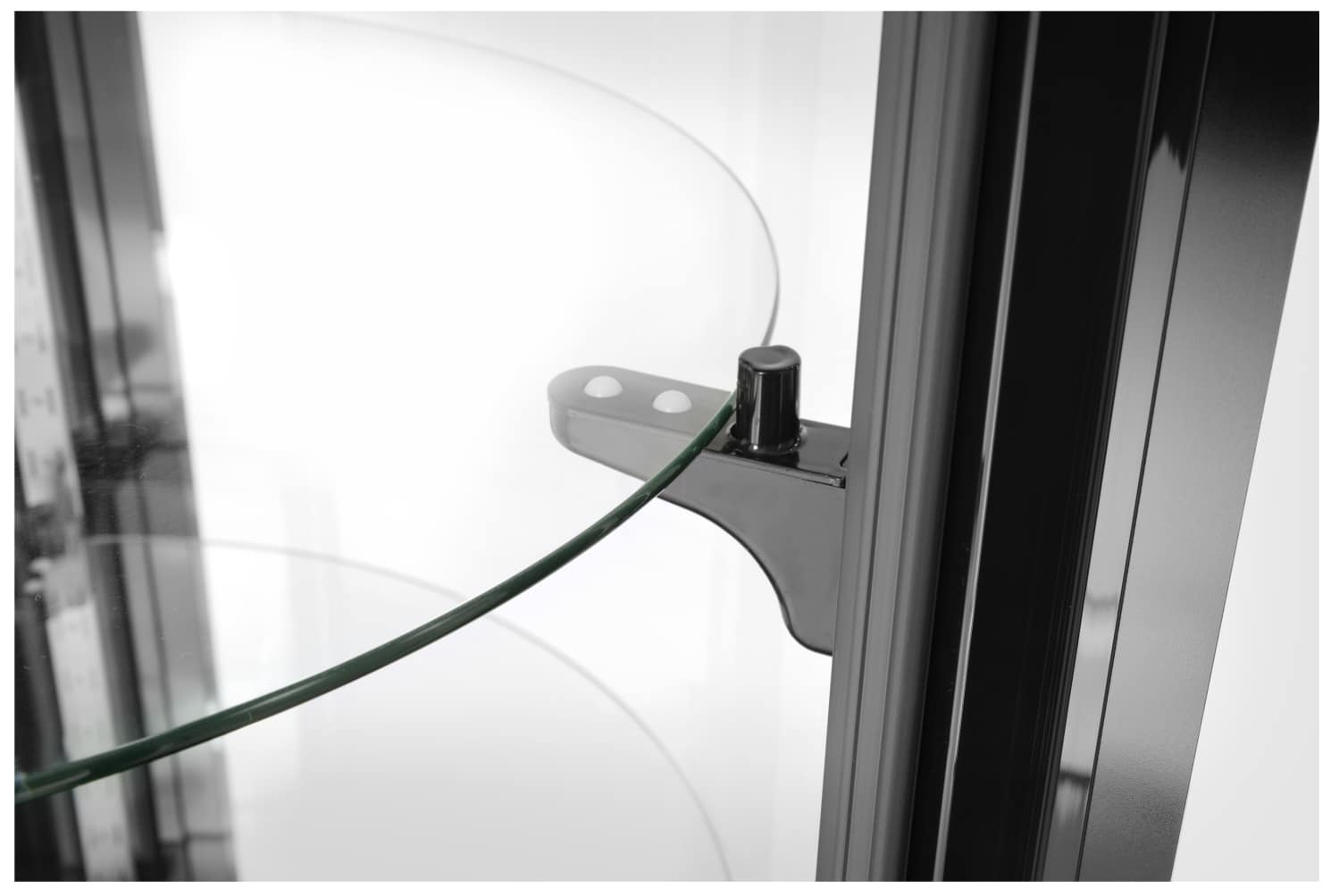 - 4 półki – Ø 535 mm z szybą o grubości 5 mm, regulowane co 30 mm na aż 32 możliwych poziomach, pozwalają dostosować wysokość montażu w zależności od prezentowanego tortu lub deseru.