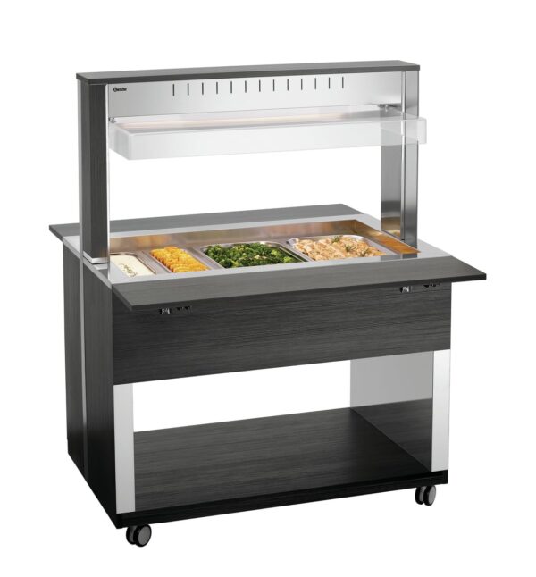Wózek bufetowy – 3×1/1 GN – 2262 W | Bartscher 125633V2 oferuje mobilne rozwiązanie bufetowe z nowoczesnym drewnianym designem – ten wózek bufetowy posiada ochronę antybakteryjną oraz oświetlenie LED. Przeznaczony do trzech pojemników 1/1 GN i wykorzystuje zasadę bain-marie do utrzymania temperatury potraw bufetowych oraz zachowania ich jakości i atrakcyjności.