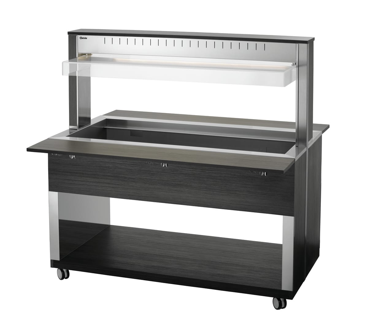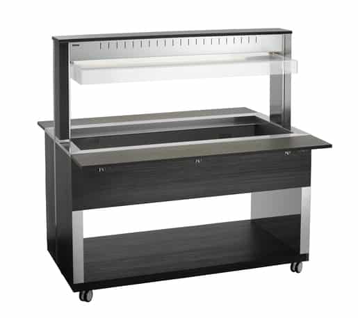 Wózek bufetowy – 4×1/1 GN – 3016 W | Bartscher 125634V2 oferuje mobilne rozwiązanie bufetowe z nowoczesnym drewnianym designem – ten wózek bufetowy posiada ochronę antybakteryjną oraz oświetlenie LED. Przeznaczony do czterech pojemników 1/1 GN i wykorzystuje zasadę bain-marie do utrzymania temperatury potraw bufetowych oraz zachowania ich jakości i atrakcyjności.