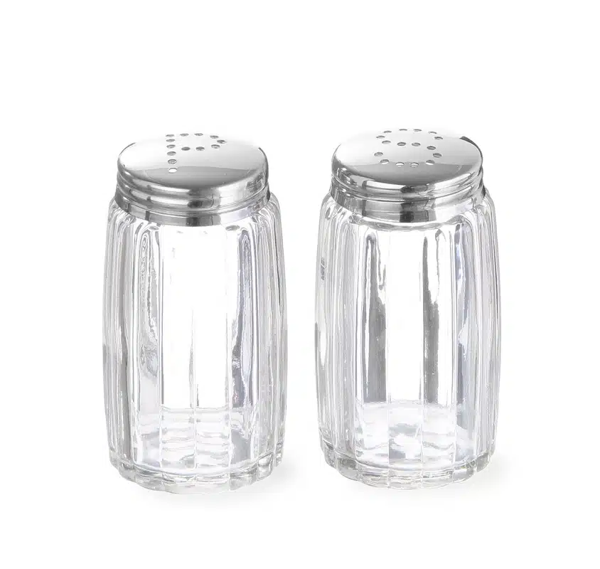 Zestaw do przypraw – dwuczęściowy – Ø 40 x 70 mm | Hendi 465387 wykonany jest ze szkła, a pokrywka ze stali nierdzewnej z otworami dozującymi w kształcie S i P. W zestawie znajduje się solniczka i pieprzniczka.